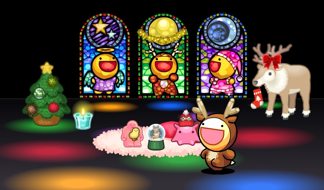 今回はステンドグラスの背景と同じ、トナカイの服にお着換え。