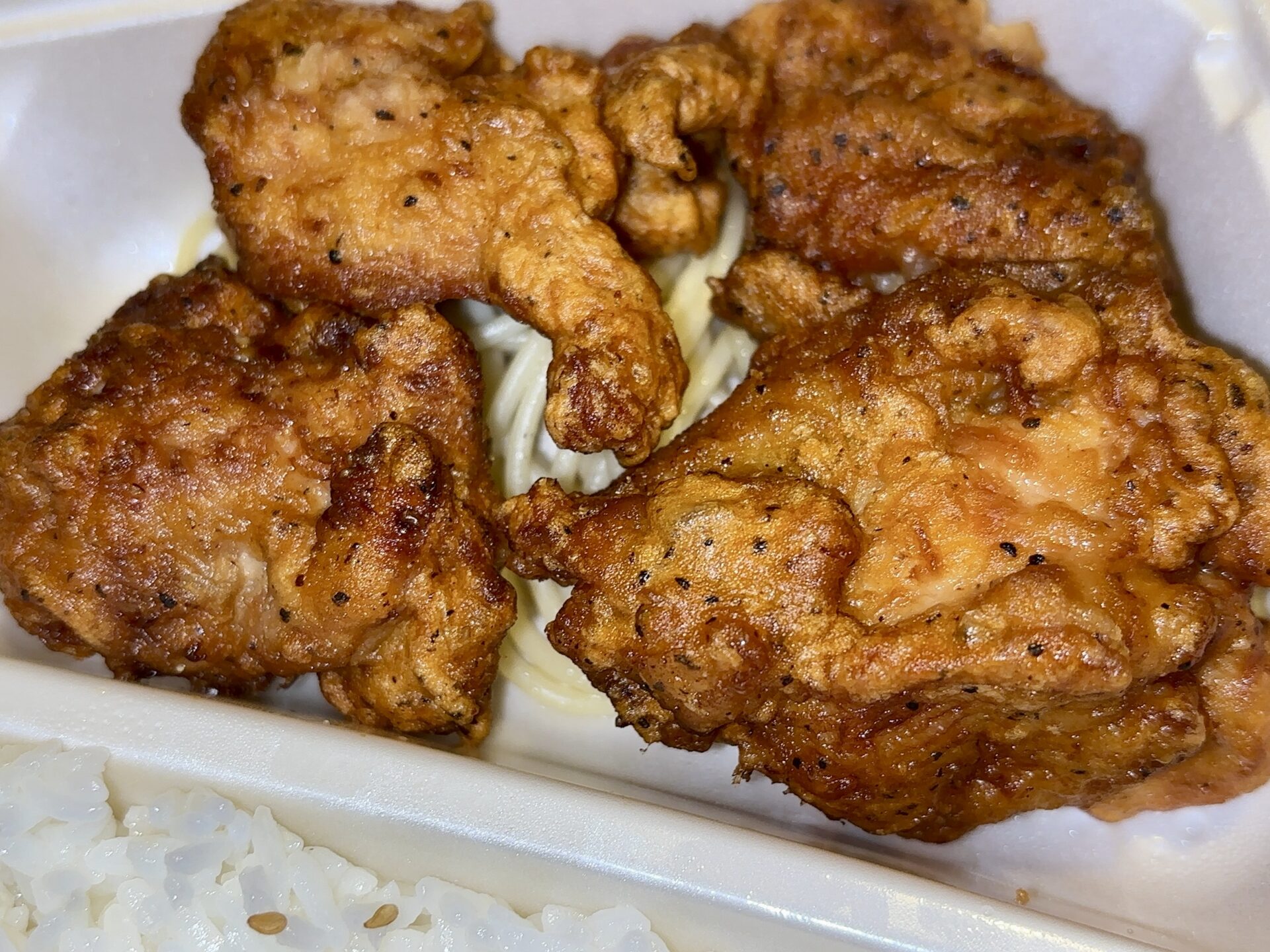 ブラックペッパーがきいた唐揚げ、ごろっと大きくジューシーでご飯がどんどん進みます。